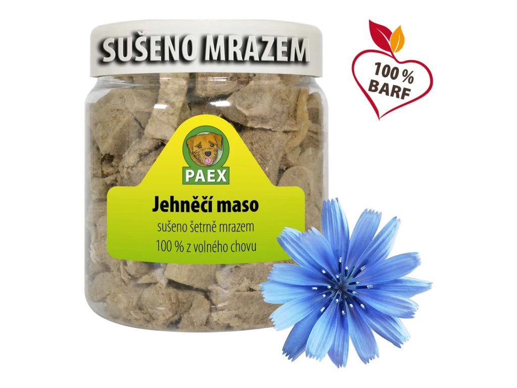 Sušení mrazem zachovává nutriční hodnoty i chuť. Jehněčí maso je 100% kvalitní ze zvířat z volného chovu. Sušení probíhá tak, že se hluboce zmražené maso vloží do vakuové komory a během 24 hodin se z něj odpaří zmrzlá tekutina. Během sušení ztratí přibližně 2/3 hmotnosti, ale veškeré minerální látky a vitamíny zůstanou zachovány. Stává se tak neomezeně skladovatelné bez nutnosti chlazení a mražení. Výrobce: Paex.de.