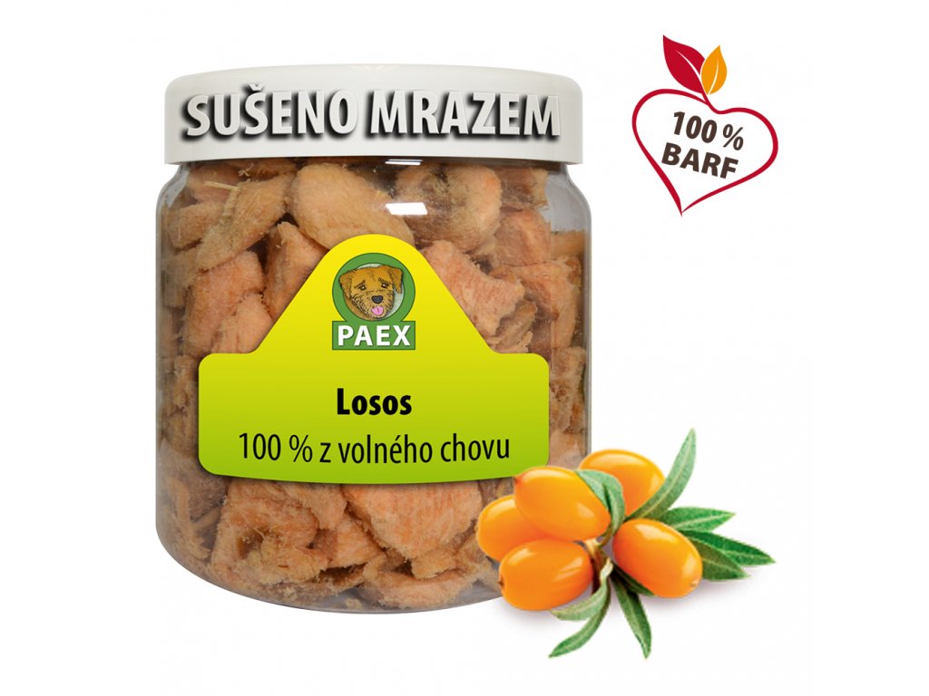 Sušení mrazem zachovává nutriční hodnoty i chuť. Losos je 100% kvalitní, pochází převážně z volného moře. Sušení probíhá tak, že se hluboce zmražené maso vloží do vakuové komory a během 24 hodin se z něj odpaří zmrzlá tekutina. Během sušení ztratí přibližně 2/3 hmotnosti, ale veškeré minerální látky a vitamíny zůstanou zachovány. Stává se tak neomezeně skladovatelné bez nutnosti chlazení a mražení. Výrobce >> Paex.de.