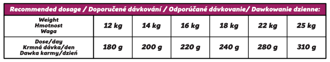 Doporučujeme rozdělit denní dávku na 2 porce. Krmivo se podává suché, svému psovi zabezpečte přístup k čerstvé vodě. Individuální nutriční potřeby závisí na faktorech, jako je věk, plemeno, aktivita a fyziologický stav. Ujistěte se, že je pytel po každém podávání správně uzavřen a skladujte ho na suchém a chladném místě mimo přímé sluneční světlo.