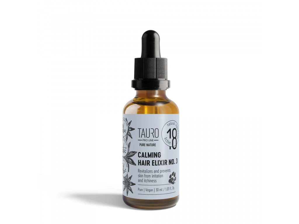 Směs esenciálních olejů Elixír TAURO PRO LINE Pure Nature pro zklidnění kůže a srsti No. 3 – luxusní, profesionální přípravek pro zklidňující péči o srst a kůži pro psy a kočky všech plemen.