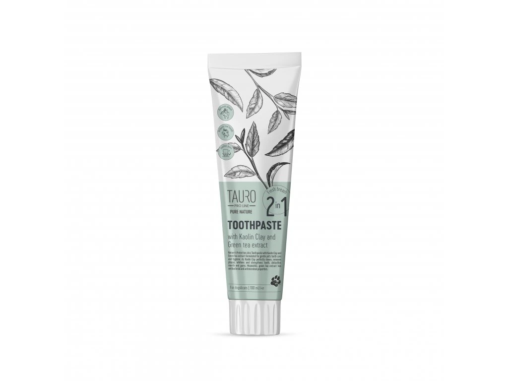Zubní pasta Tauro Pro Line Pure Nature 2v1 s bílým jílem (kaolinem) a zeleným čajem je vytvořena tak, aby udržovala dokonalou ústní a zubní hygienu vašeho mazlíčka. Zubní pasta pomáhá udržovat dobré zdraví ústní dutiny a zubů u psů a koček. Při pravidelném používání zubní pasta a její složky jemně čistí zuby a pomáhají předcházet usazování plaku. Bílý jíl (kaolin) v této zubní pastě čistí, bělí a chrání zuby a dásně před usazováním plaku. Kaolin je zcela přírodní a účinný prostředek na čištění zubů, jehož použití je zcela bezpečné. Zelený čaj má antibakteriální vlastnosti a pravidelné používání zubní pasty minimalizuje růst bakterií a zklidňuje dásně. Zubní pasta může pomoci snížit zápach z tlamy a dodává svěží pocit.